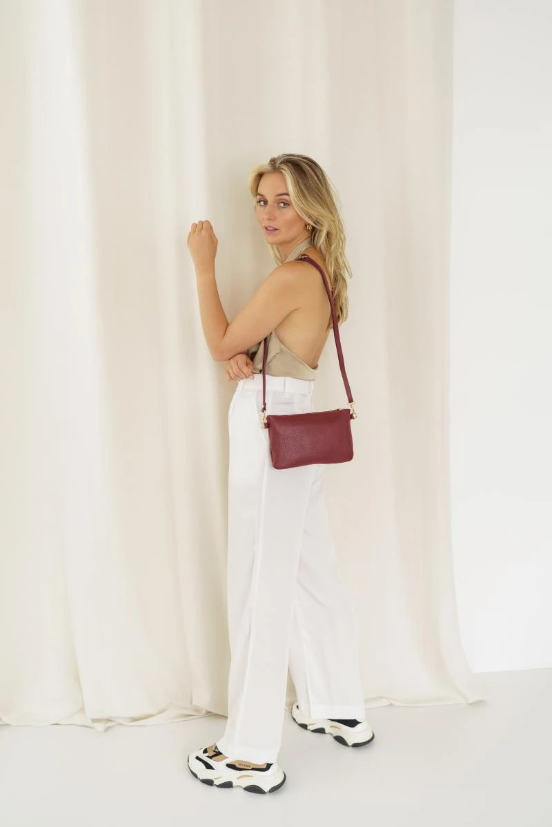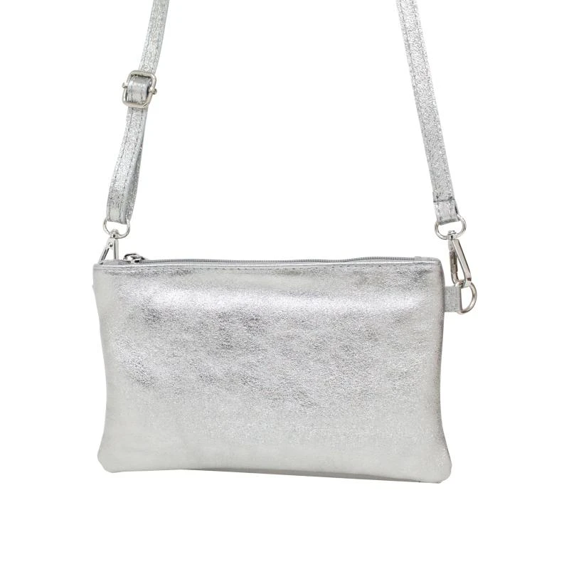 Bijzonderheden: De tas sluit d.m.v. een ritssluiting. Het hengels is van echt leer, in lengte verstelbaar en afneembaar. De tas heeft een extra hengsel waarmee de tas om de pols gedragen kan worden.