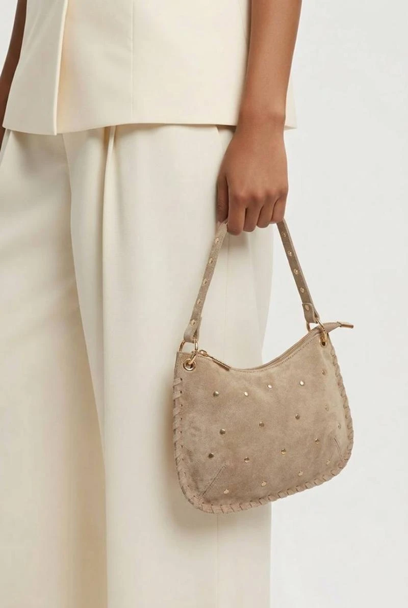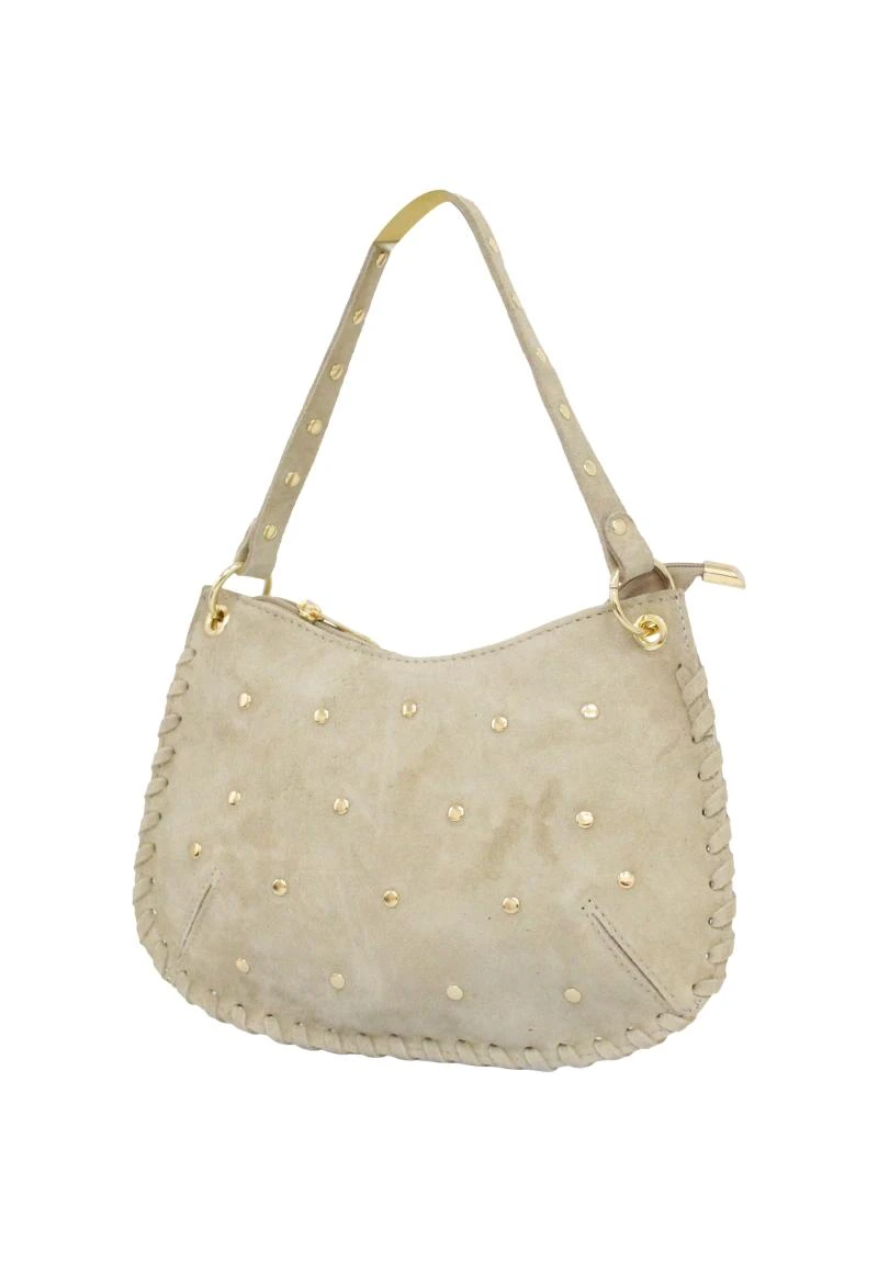 Bijzonderheden: De tas sluit d.m.v. een rits. De tas wordt geleverd met een in lengte verstelbaar schouderhengsel. Dit hengsel is gemaakt van hetzelfde materiaal als de tas (suède)