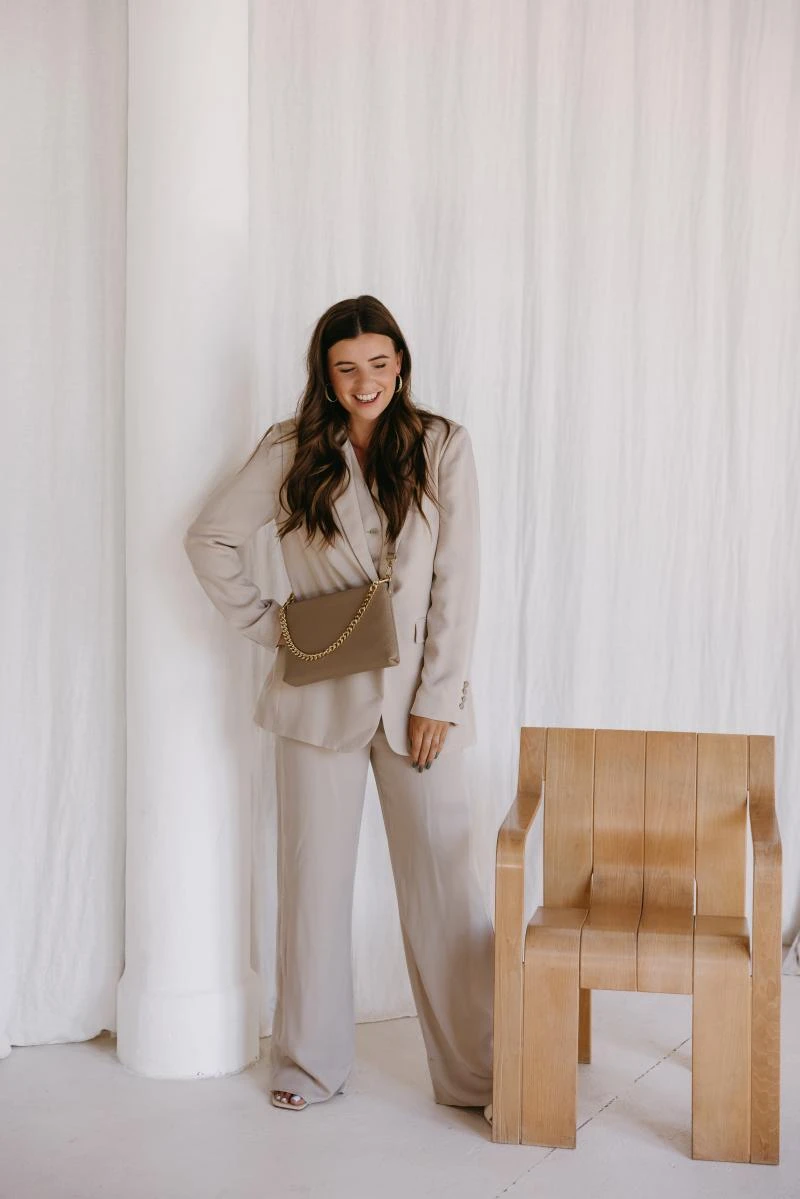 Bijzonderheden: De tas sluit d.m.v. een rits. De tas wordt geleverd met een in lengte verstelbaar schouderhengsel. Dit hengsel is gemaakt van hetzelfde materiaal als de tas (leer). Verder wordt er ook een gouden (kort) hengsel mee geleverd. Dit hengsel bestaat uit een schakelketting.
