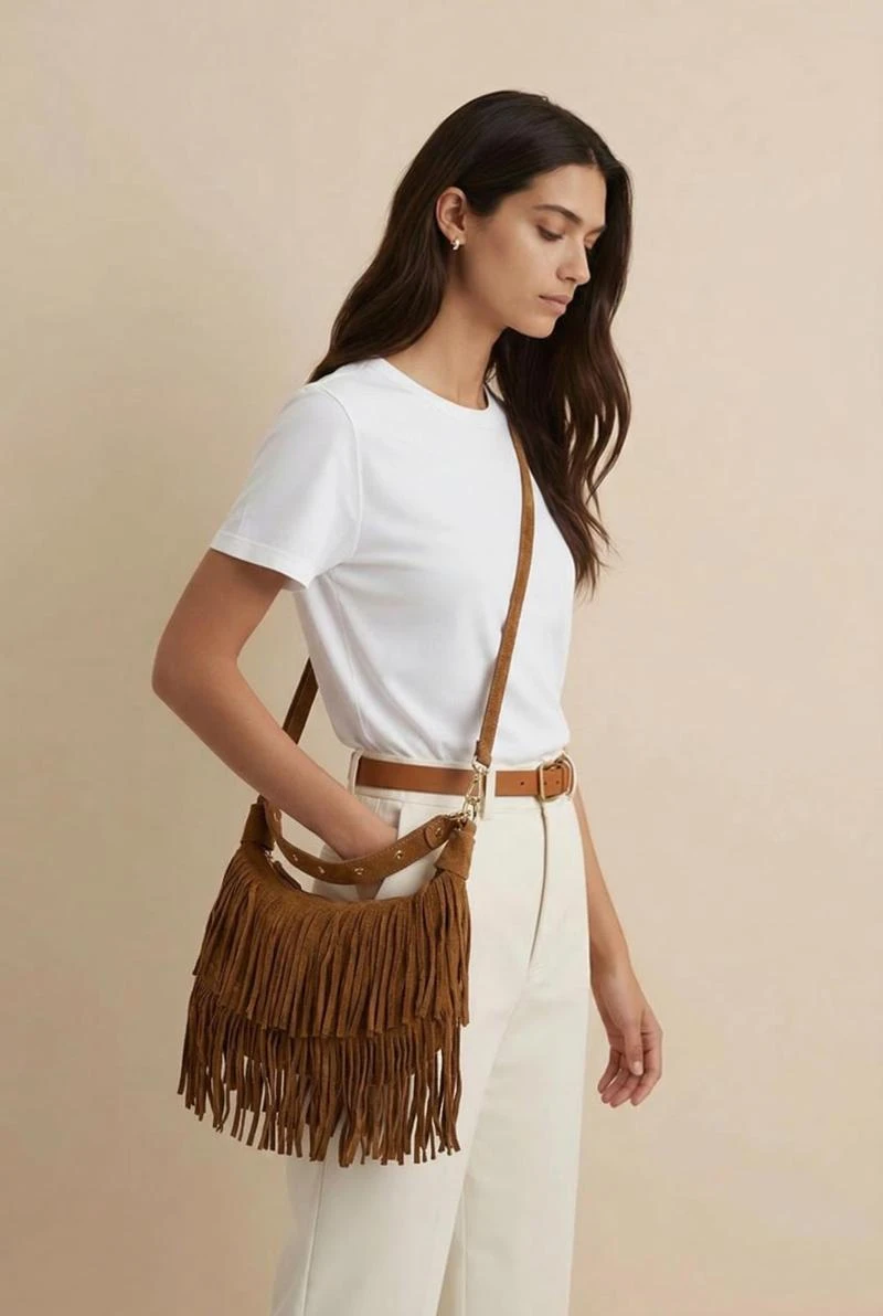 Bijzonderheden: De tas sluit d.m.v. een rits. De tas wordt geleverd met een in lengte verstelbaar schouderhengsel. Dit hengsel is gemaakt van hetzelfde materiaal als de tas (suède). Verder heeft de tas een breder hengsel waarmee de tas zowel in de hand als om de schouder gedragen kan worden.