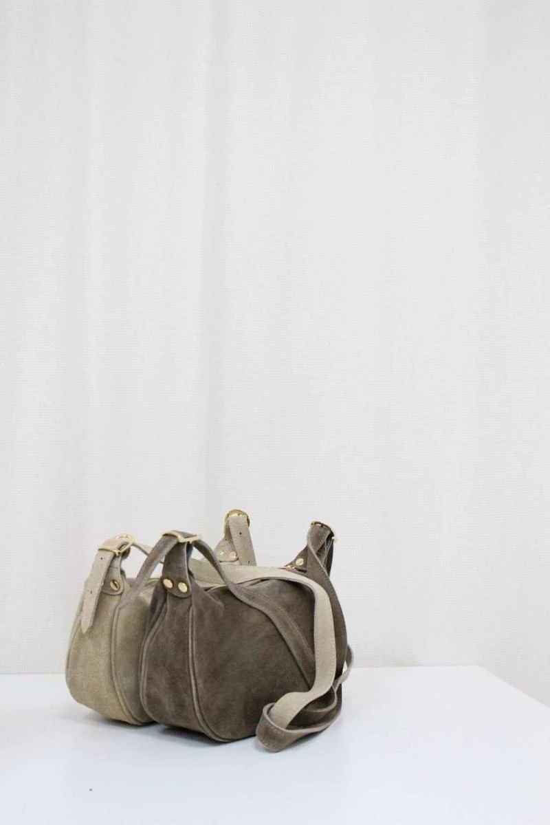 Bijzonderheden: De tas sluit d.m.v. een rits. De tas wordt geleverd met een in lengte verstelbaar schouderhengsel. Dit hengsel is gemaakt van hetzelfde materiaal als de tas (suède).
