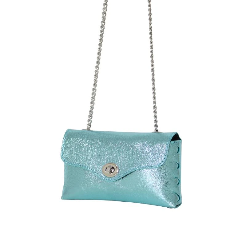 Bijzonderheden: De tas sluit d.m.v. een draaisluiting aan de voorzijde van de tas. De tas wordt geleverd met een zilverkleurige ketting, deze ketting is niet afneembaar.